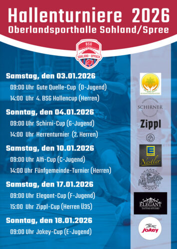 Den Auftakt macht am 03.01. die vierte Auflage des BSG-Cups, der sich in den vergangenen Jahren längst einen festen Platz im Hallenkalender erarbeitet hat. Bereits einen Tag später, am 04.01., feiert die zweite Männermannschaft ihre Premiere auf dem Hallenparkett und lädt zur Erstauflage ihres eigenen Turniers ein.